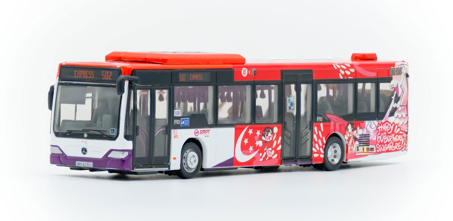 Citaro | Red/purple/white with 'Happy 60th Birthday Singapore' | SBS6235B | 502* | Express* | 08/25 |