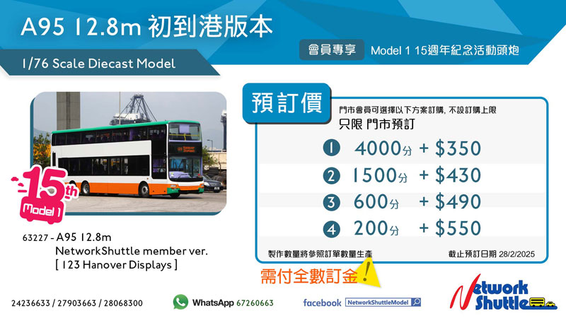 Network Shuttle has today announced an exclusive members only model to mark the 15th anniversary of Model 1. It features New World First Bus 12.8 metre Gemilang bodied MAN A95 in 'as delivered' condition, with no fleetnames and with a destination of 123 Hanover Displays. The model is expected to be released in October. Full details can be found on the Network Shuttle Facebook page.