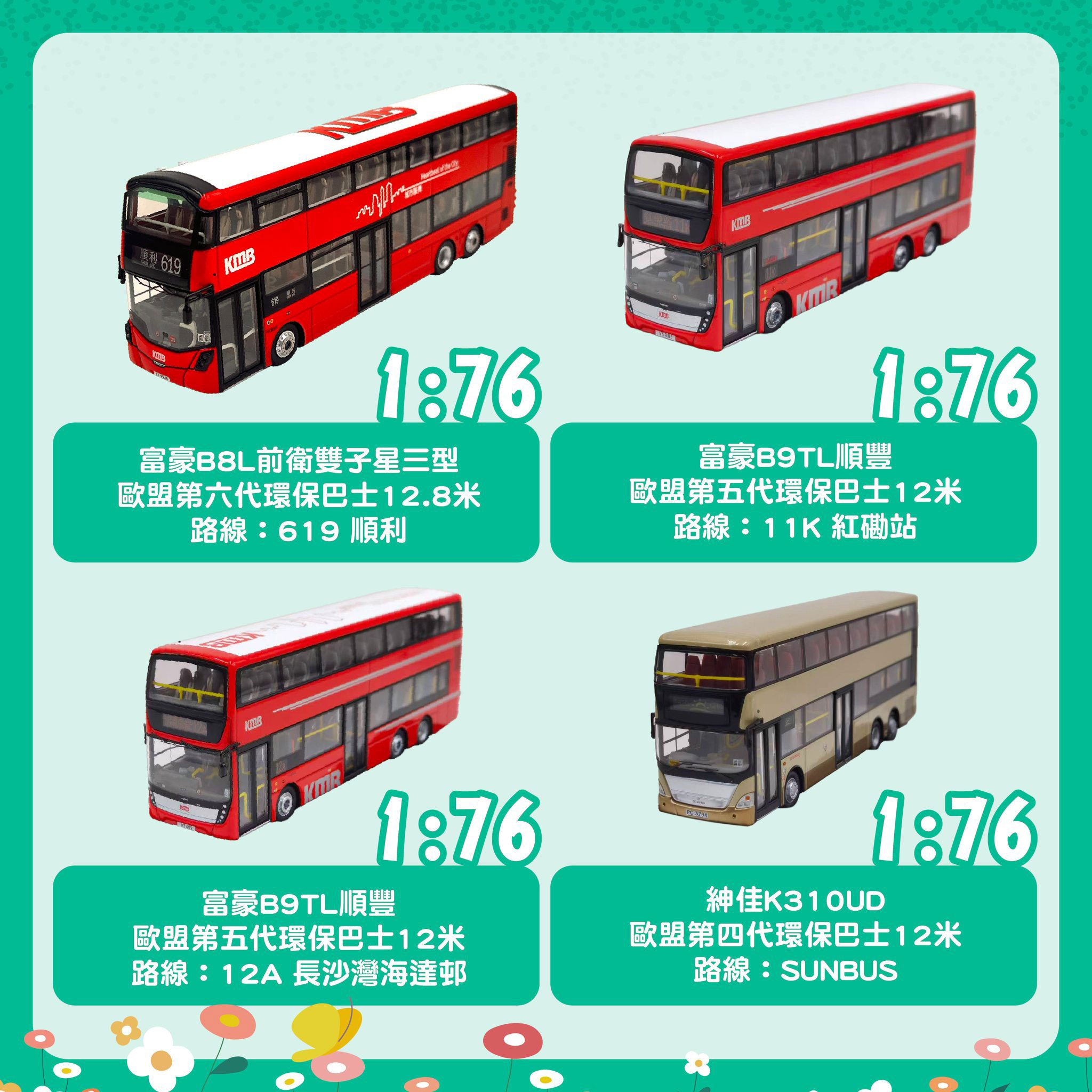 Among a number of new models in various scales announced today by Kowloon Motor Bus are these four 1/76 examples. Top left is 12.8 metre Wrights Gemini 3 bodied Volvo B8L V6X167 (YJ9948) on route 619 to Shun Lee. Next (top right) is Gemilang bodied Volvo B9TL AVG1 (VS9188) on route 11K. Bottom left is a second Gemilang bodied Volvo B9TL, this time featuring AVG3 (VT4112) on route 12A and finally Salvador Caetano bodied Scania K310UD ASU17 (PC3794), with a destination of 'Sun Bus', is shown bottom right.