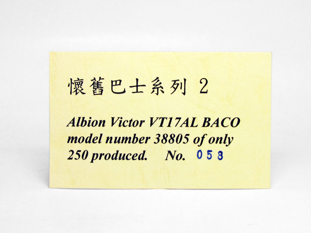 The bus - in March 1960, Kowloon Motor Bus took delivery of an Albion Victor VT17AL demonstrator and a subsequent order for 100 further vehicles was placed. All carried British Aluminium Company bodies, produced in England and shipped to Hong Kong ckd (completely knocked down) for assembling by KMB. |