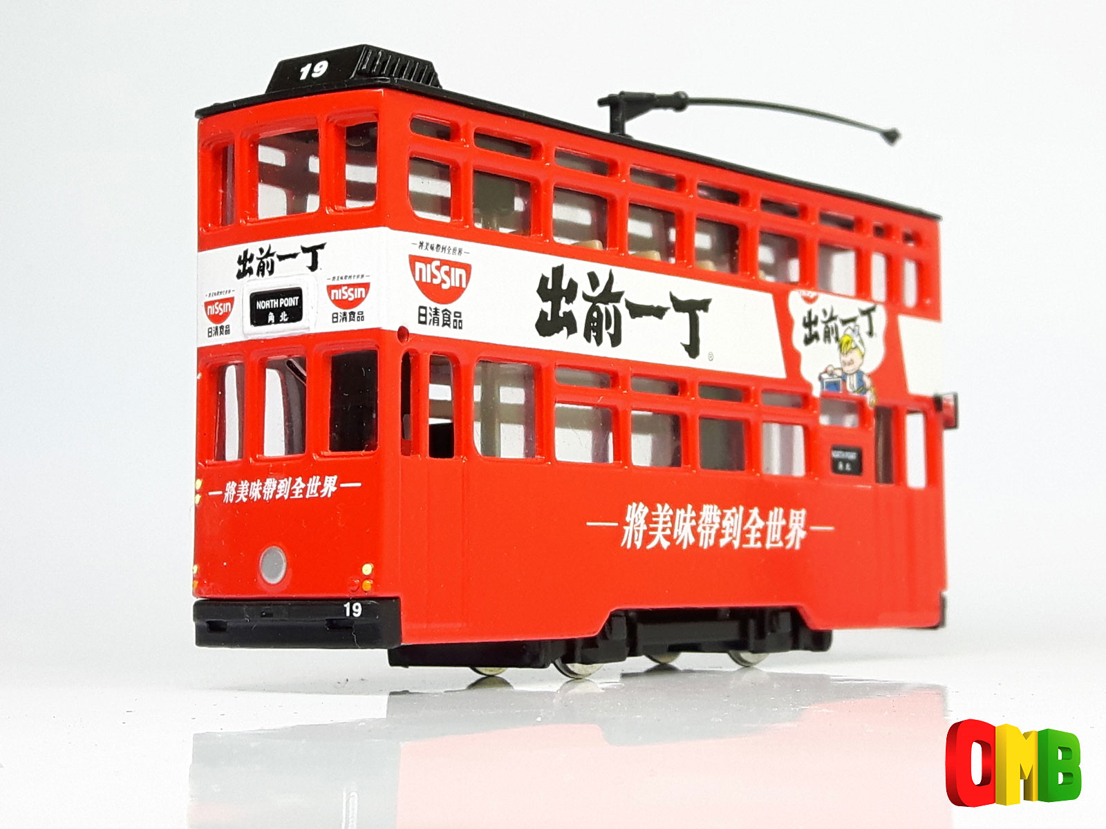 This tram carries all-over advertising for 'Nissin' . The model features tram no. 19 on it's way to North Point. It is believed to have been issued in 1999 and comes in the standard 'Hong Kong Wonders' green box with a postcard style certificate confirming it is one of 3,000. |