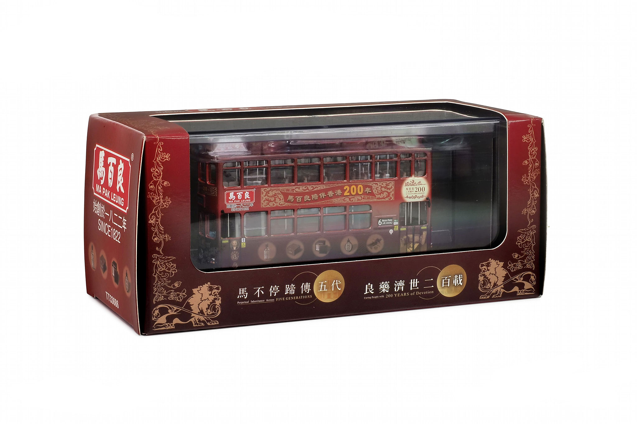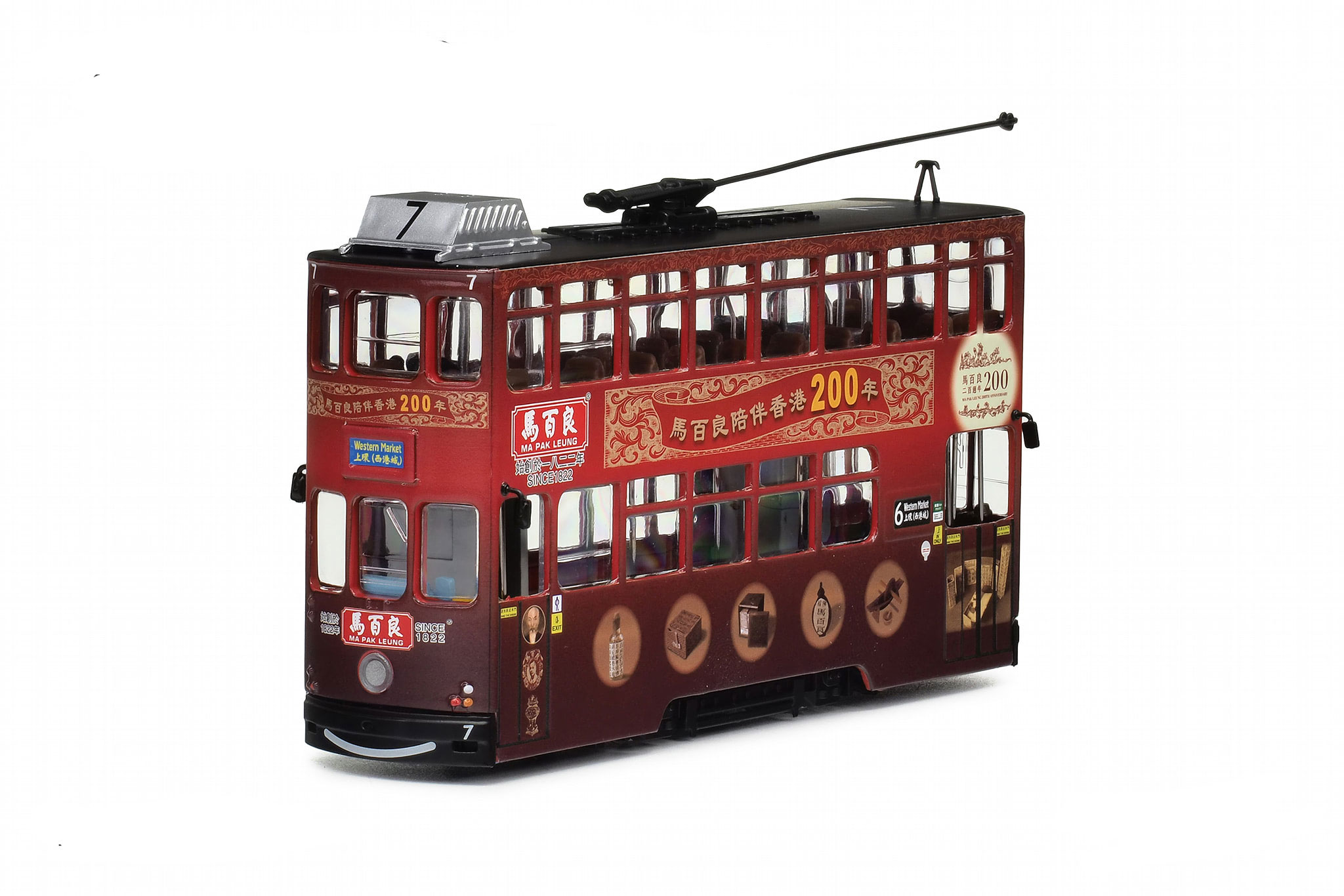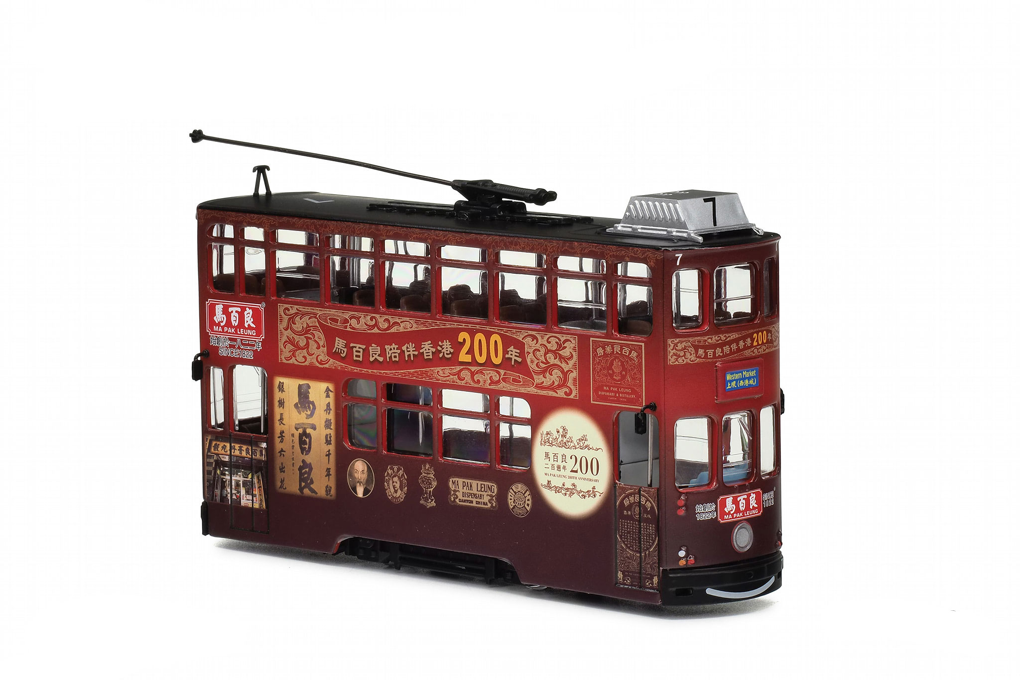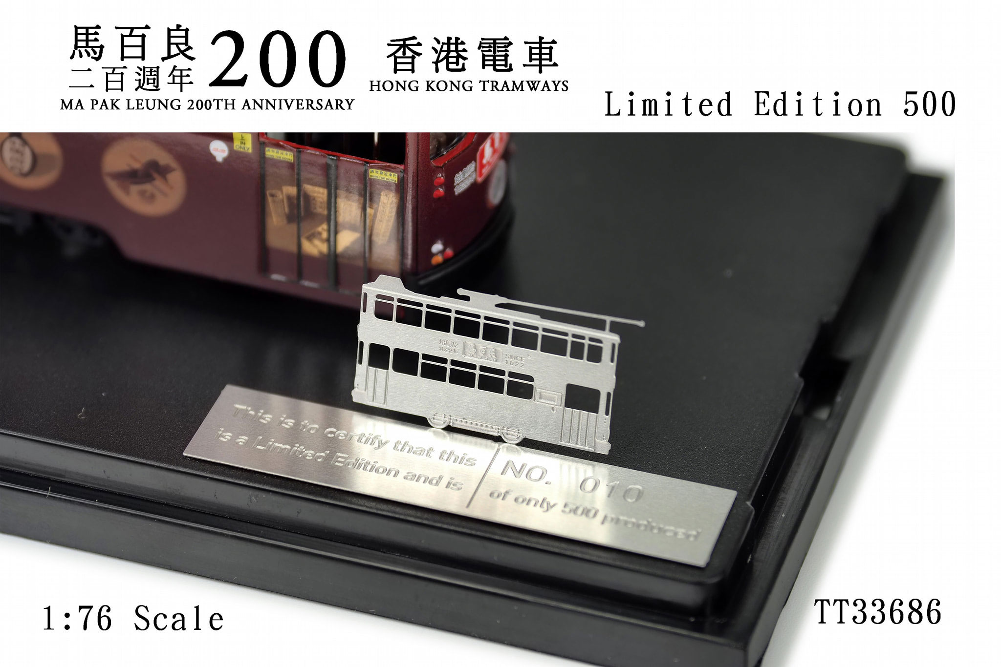This tram was released on 24th July 2023 and carries all-over advertising for Ma Pak Leung, marking that company's 200th anniversary. It is limited to 500 pieces, and the plastic plinth carries an engraved limited edition certificate, as shown in the photograph below. | ||||||||||||
