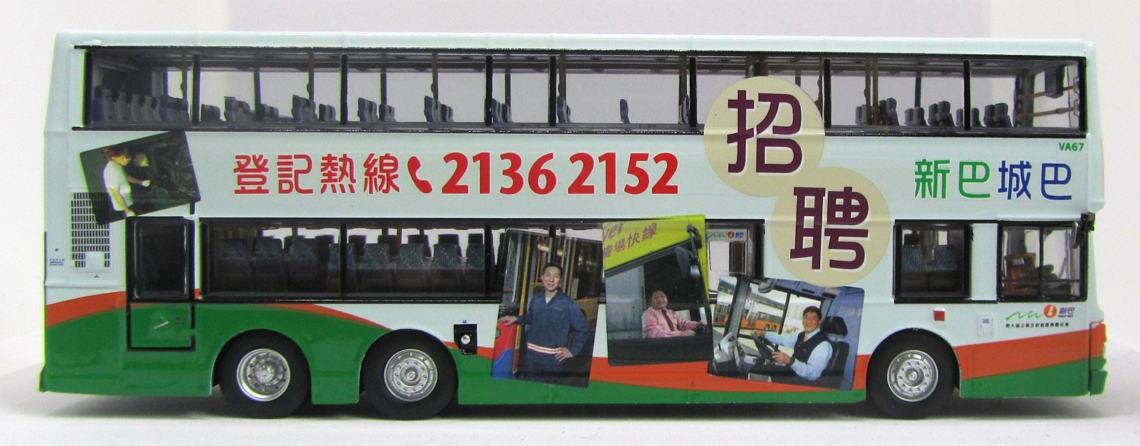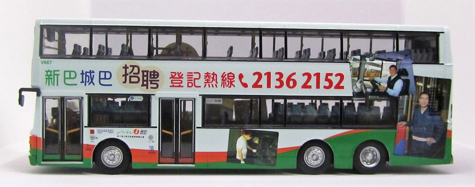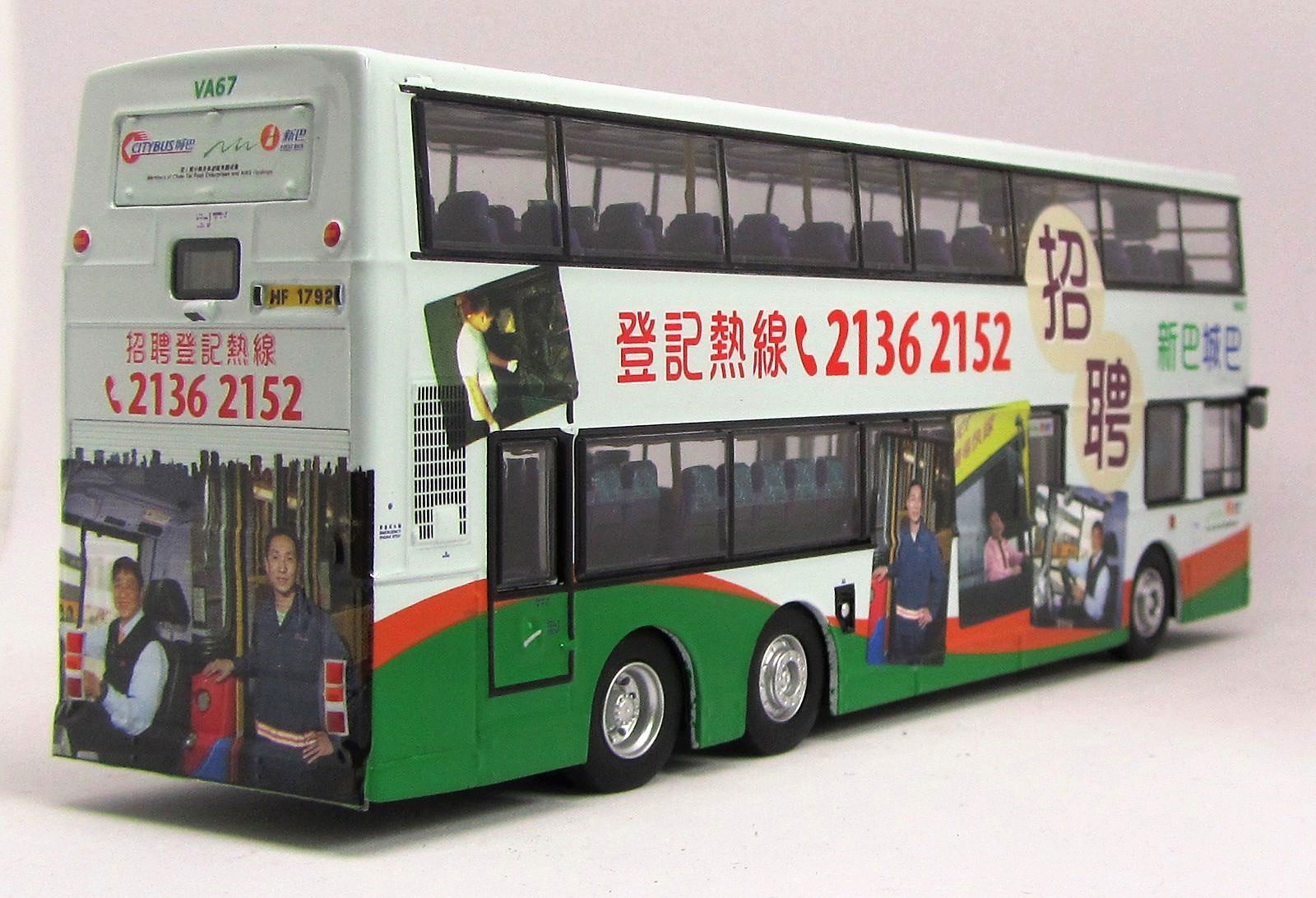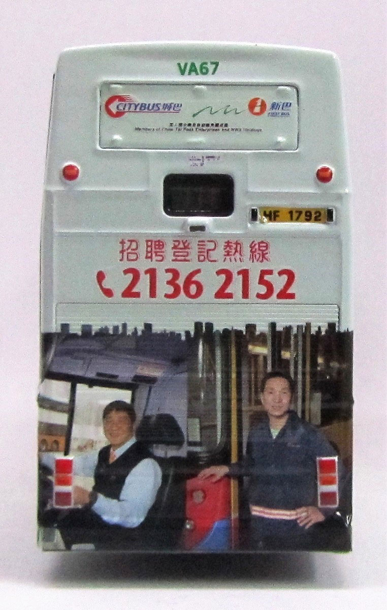 The bus - On 12th March 2014 ten Citybus 12-metre Volvo Olympians were to be transferred to the New World First Bus fleet. The buses were renumbered VA67 to VA76 and the first of the batch carried NWFB driver recruitment advertisements. VA67 was originally Citybus 621 and was first registered on 7th July 1997. |