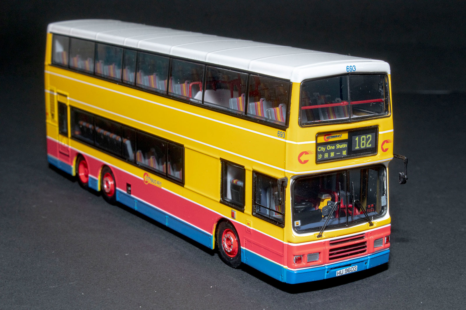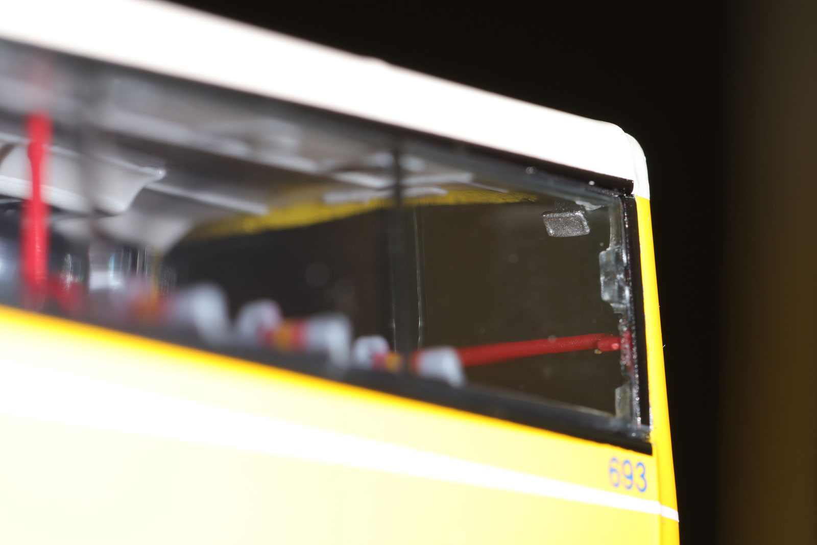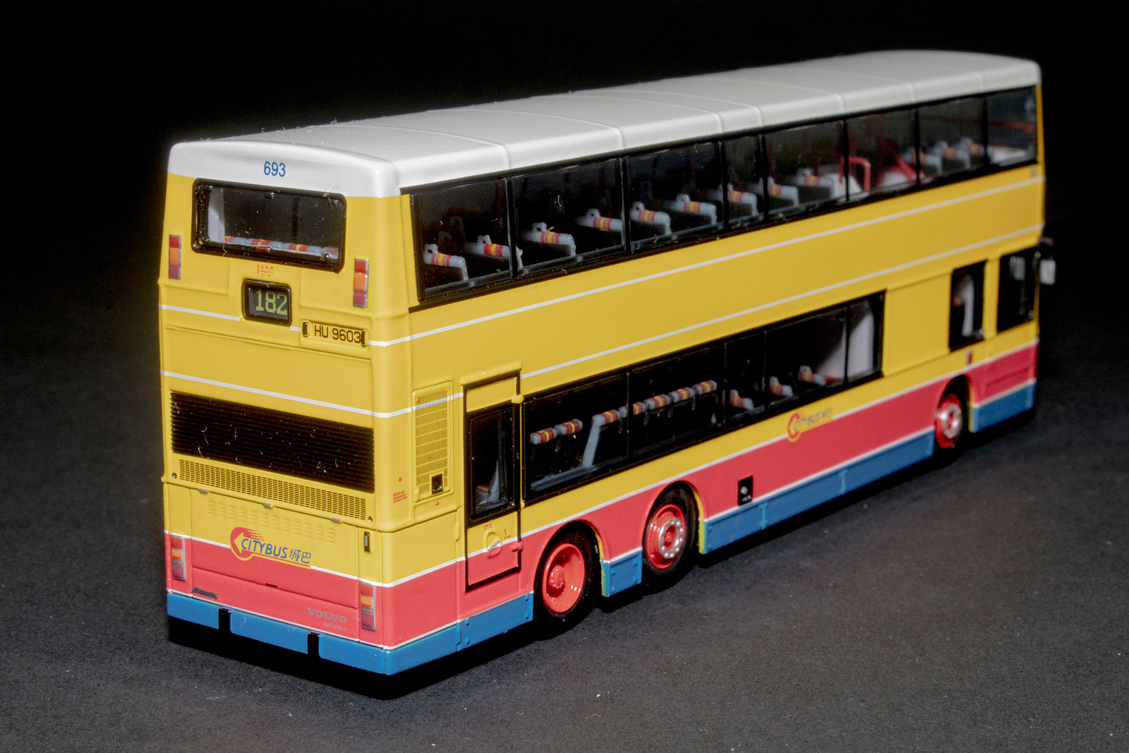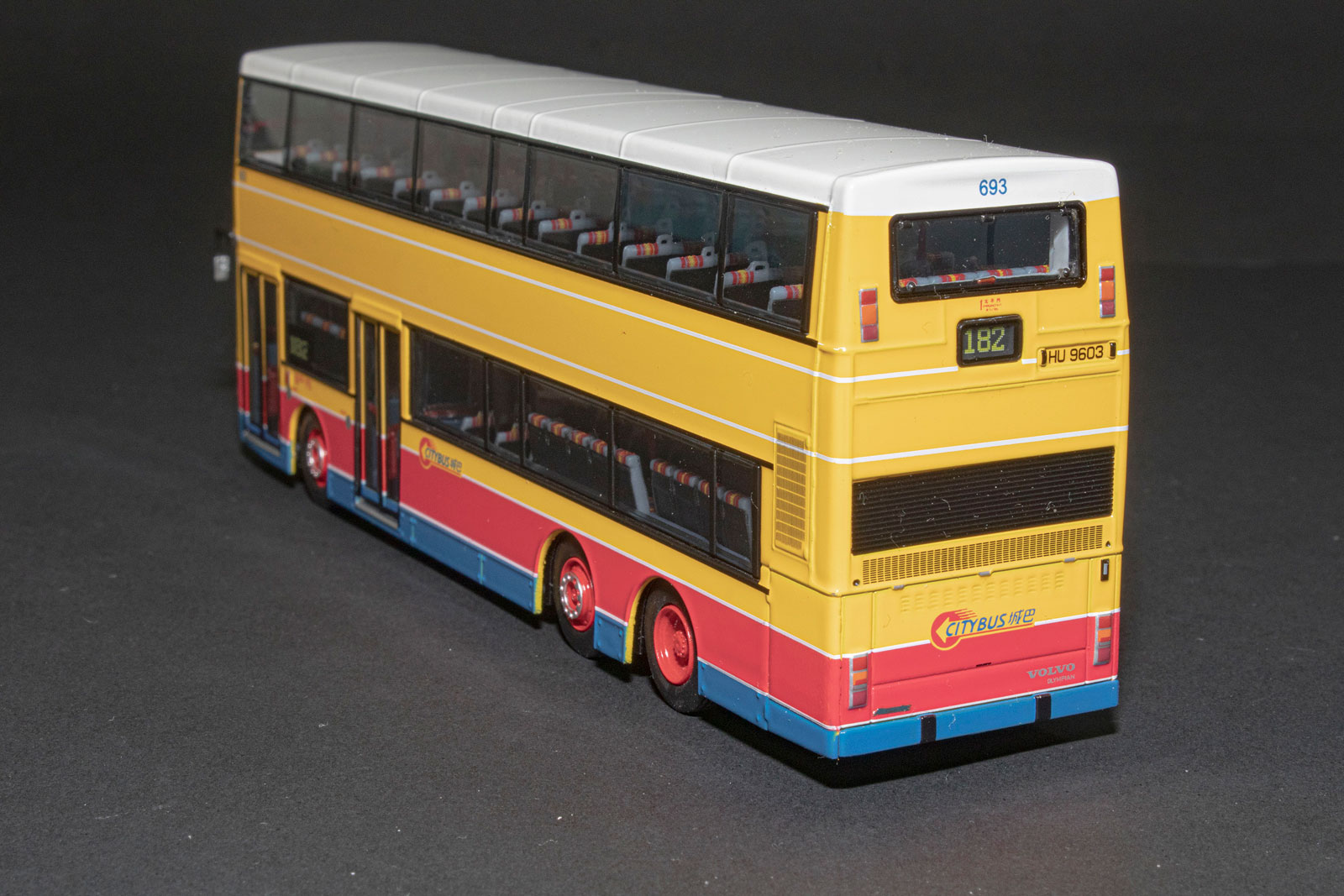 by Model 1 during the summer of 2017. My thanks to West Dan for providing a detailed set of photographs of the model. The bus - Citybus took delivery of over three-hundred 12-metre Volvo Olympians between February 1994 and August 1998. 693 was first registered on 30th July 1998 and was retired on 26th May 2017. |
