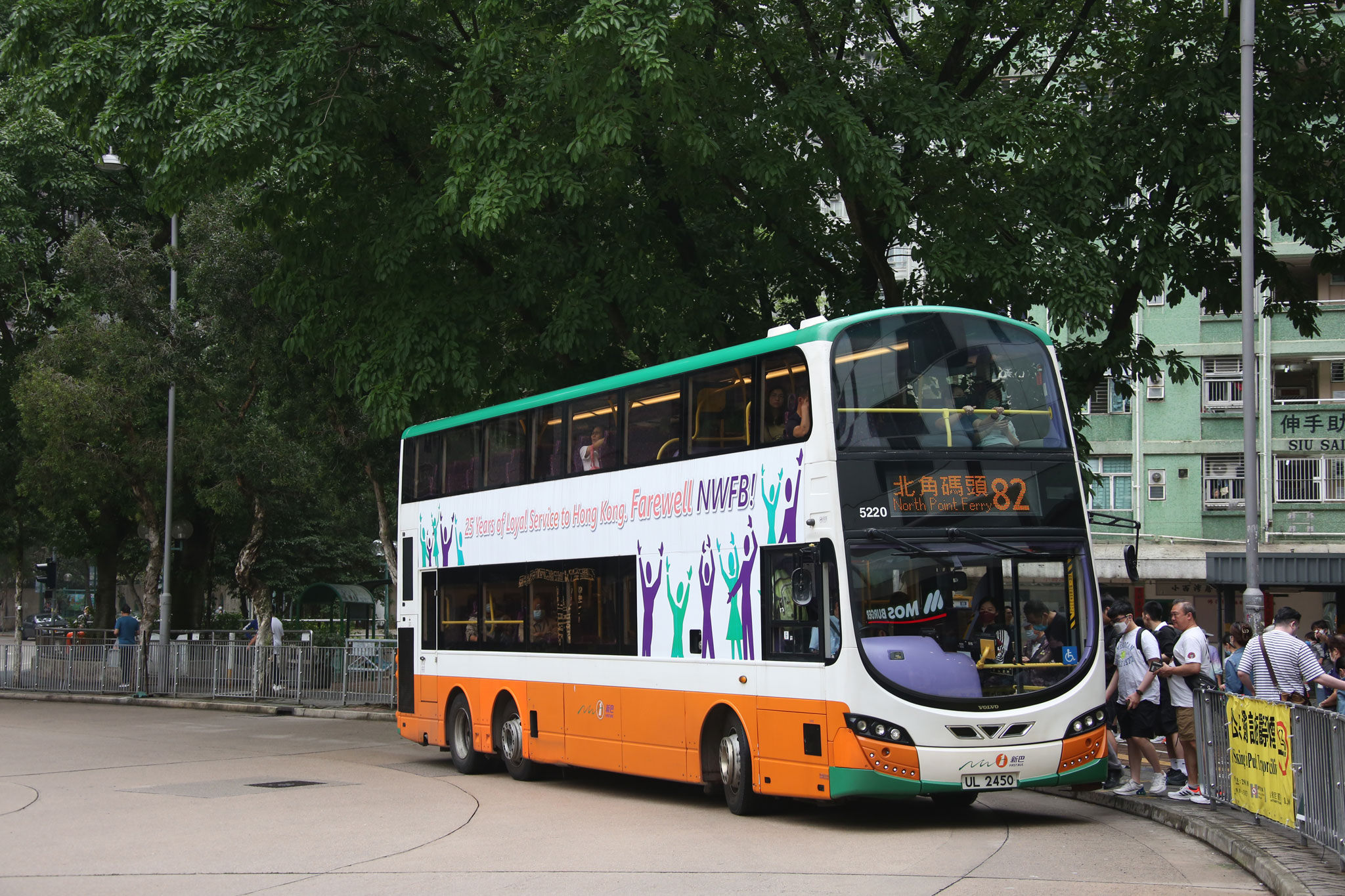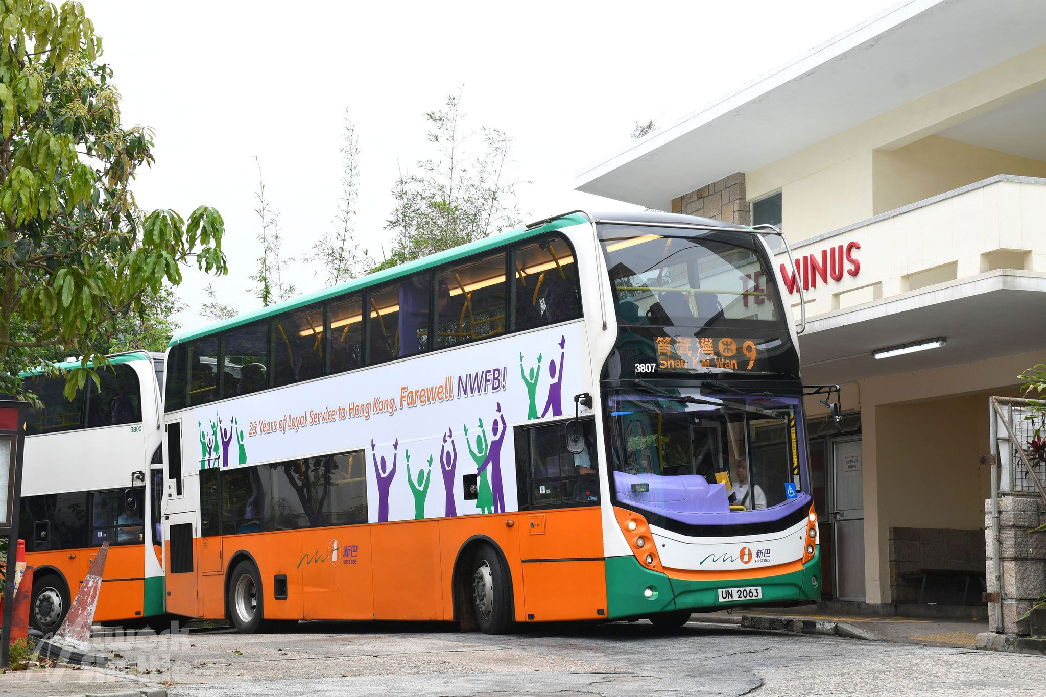 Citybus. At the end of March 2023 the company applied original 'wave' livery to two ADL Enviro500s, these being 5518 and 5669. On 7th April, it applied 'Farewell NWFB' banner advertising to several Wrights Eclipse Gemini 2 bodied Volvo B9TLs, including 5200, 5206 and 5220. The banner reads '25 Years of Loyal Service to Hong Kong, Farewell NWFB!' A week later, original 'wave' livery was applied to Wrights Gemini 3 bodied Volvo B8L 5230 (WN2615). On 25th April the company announced it had applied 'Farewell' decals to two ADL 'facelift' Enviro400s, these being 3807 (UN2063) and 3830 (UU3162). | |