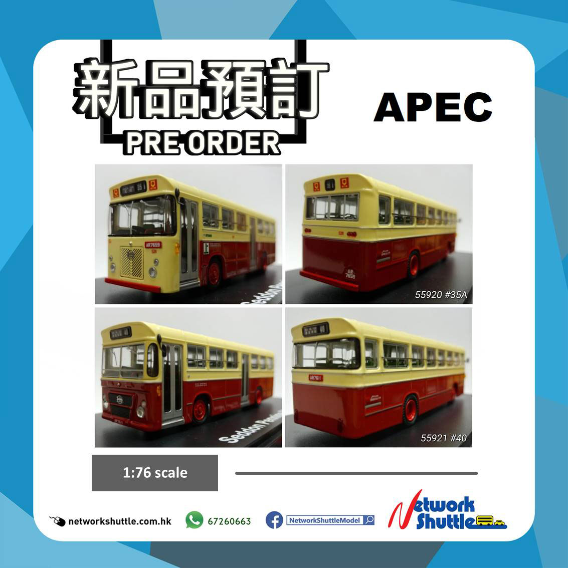 Network Shuttle has today announced two further Kowloon Motor Bus liveried Seddon Pennine IVs from APEC. AR7659 is on route 35A to Shek Yam (55920) whilst AR7611 is on route 40 to Kwun Tong Ferry (55921). Both are available to pre-order.