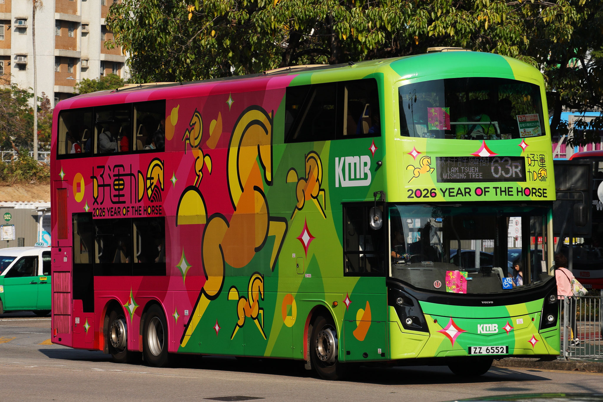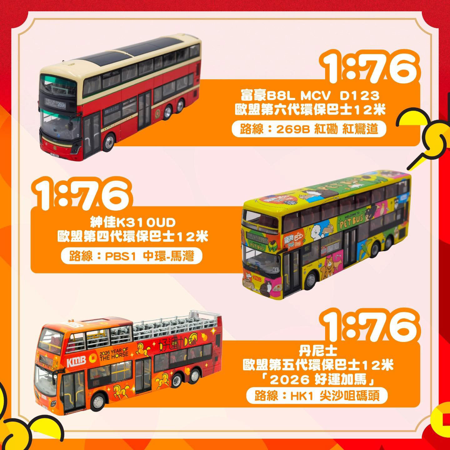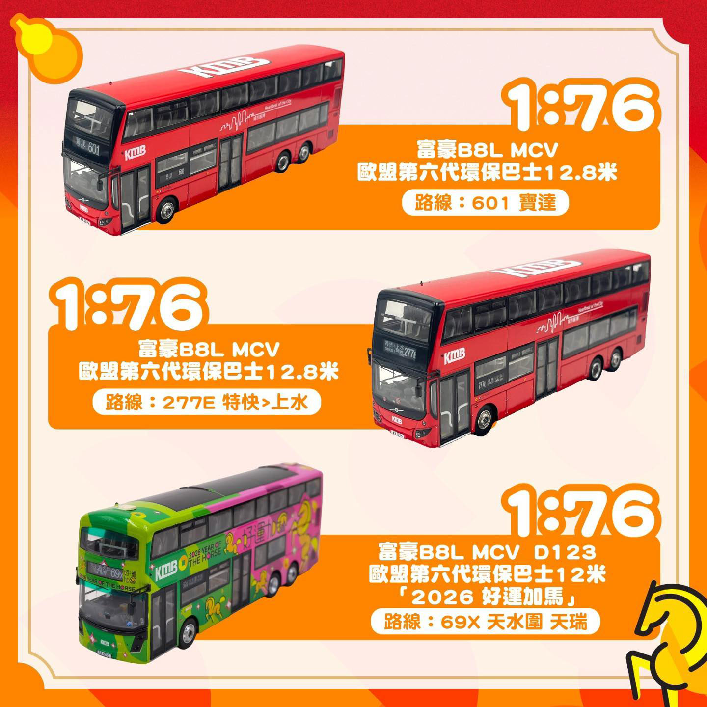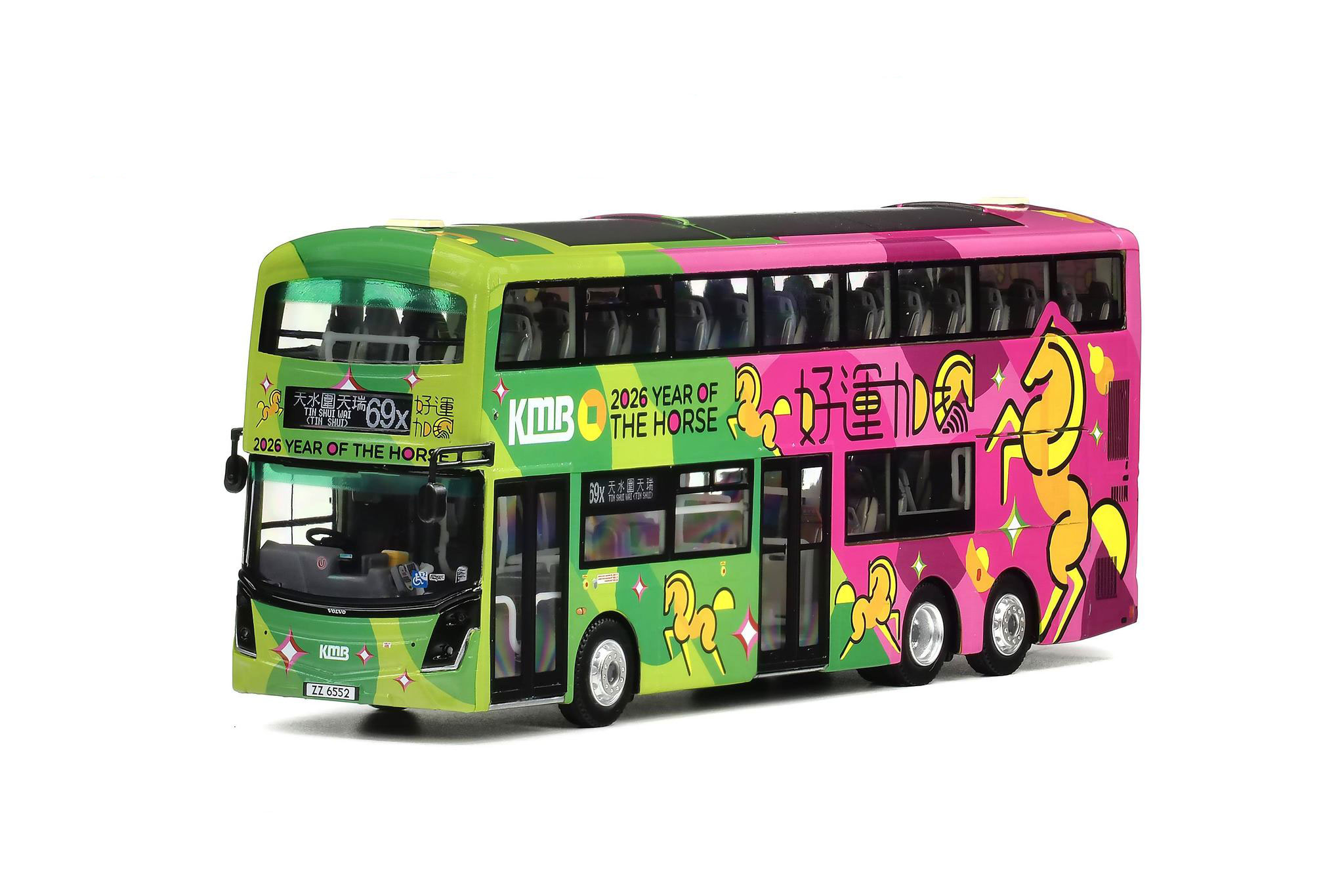 The Year of the Horse decorated MCV D123 bodied Volvo B8L features V6B210 (ZZ6552) and is on route 69X with a destination of Tin Shui Wai (Tin Shui). It carries the product code of KMB2026003 and is limited to 800 pieces.